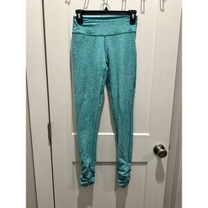 The Beyond Yoga Essential Back Gather Green Cropped Leggings in size Small are designed for activewear occasions. Made of a blend of polyester and spandex, these leggings feature a pull-on closure and a compression area on the legs for a comfortable and stretchy fit. With a waist size of 28 inches and an inseam of 22 inches, these green leggings have a skinny leg style with a capri length, perfect for activities such as yoga, running, and gym training. The back gather detail adds a stylish touch to these athleisure leggings from Beyond Yoga's product line.