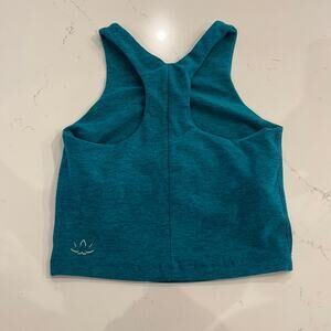In great used condition. No holes or stains. Blue/green teal heathered color. Soft Spacedye fabric. Cropped length. Built in shelf bra. Women's size Extra Small (XS).