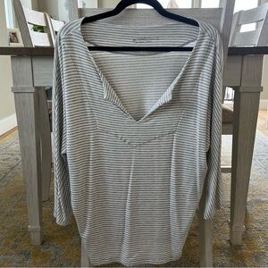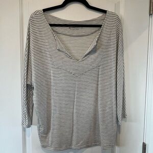 Beyond Yoga - Grey & White Striped 3/4 Sleeve V-Neck Top Relaxed Fit - Size XS