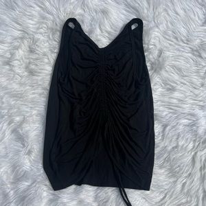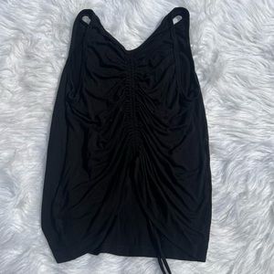 Gently used Beyond Yoga all black tank top! Cute ruched/tie detailing in the back to make it fit looser or more cropped. Size small