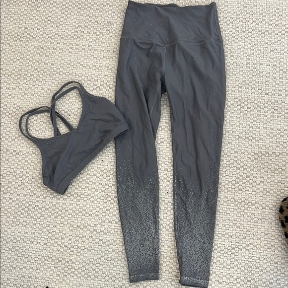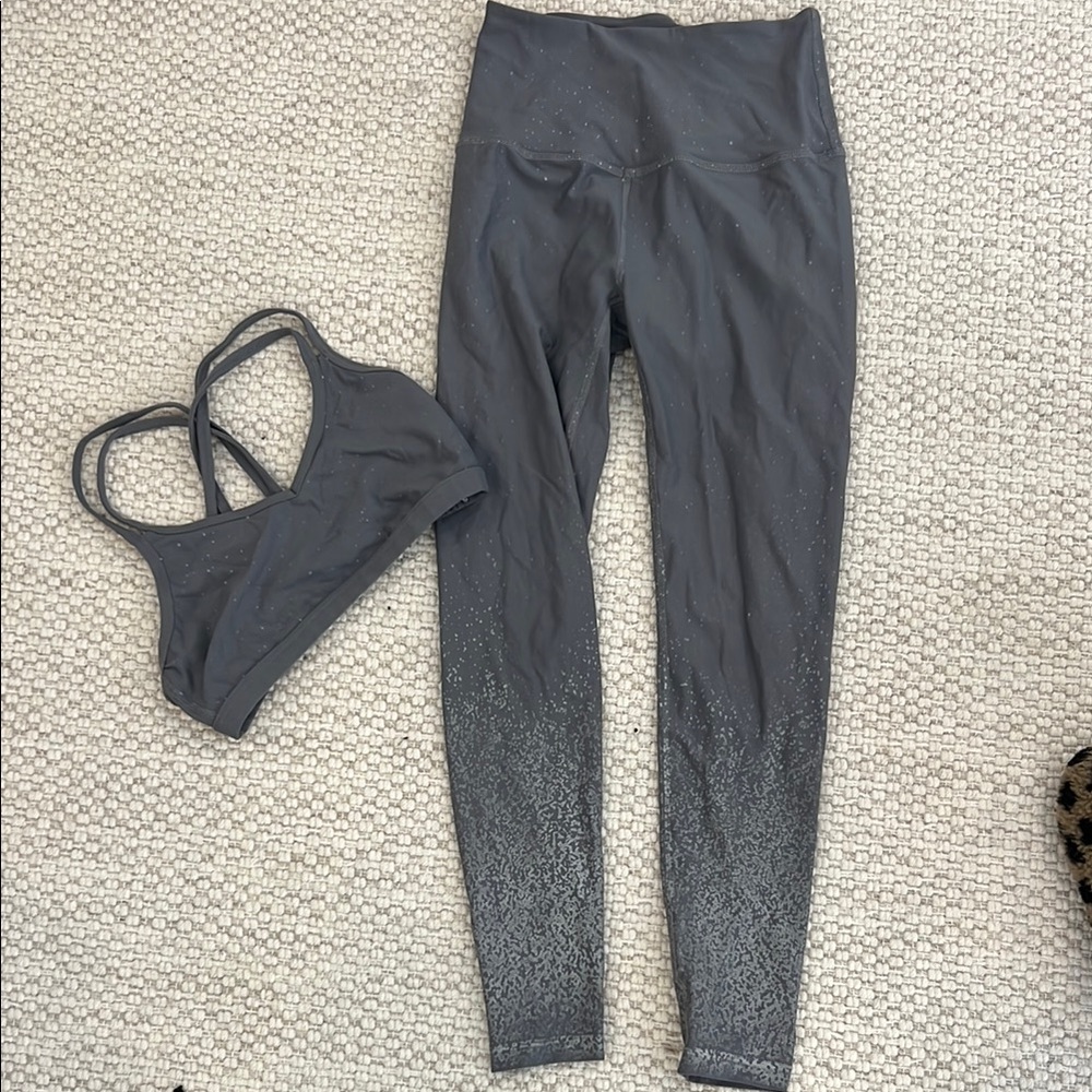 Stylish gray activewear set with leggings and sports bra. Perfect for workouts.