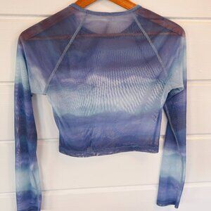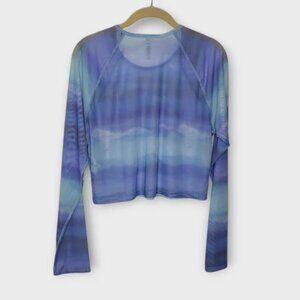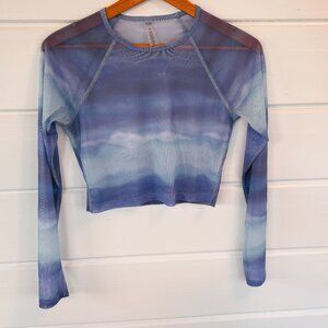 This Beyond Yoga top features a lightweight mesh, a cropped profile, a beautiful Watercolor Waves pattern/colorway, and long raglan sleeves. It has a crewneck and a sheer finish. Made of 93% polyester and 7% elastane. The length is 17.25in / 44.0cm, from shoulder. It is made in the USA.