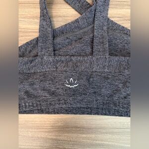 Stylish charcoal sports bra. Features cross-back straps. Comfortable and supportive.