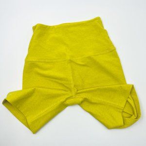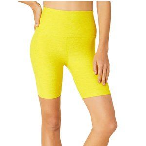 Beyond Yoga Spacedye High Waisted Biker Short in Lemon Citron ft. high waisted, 4 way stretch, uv protection, moisture wicking, designed and manufactured in the USA, no outseam, 5” waistband, sits at natural waist, performance fabric.