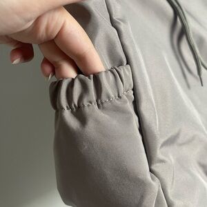 The Beyond Yoga Convertible Gym Bag in Birch is a bag that can be used as a backpack or tote and has a drawstring and snap closure. It is made of 100% polyester.