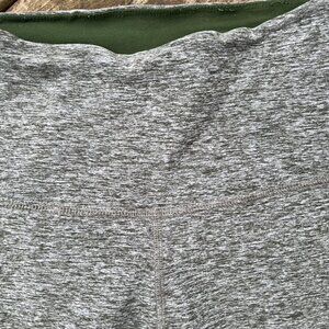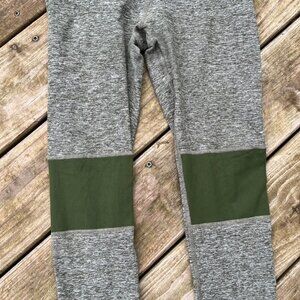 Style: Colorblock leggings in green all heathered (space dye) and incredibly soft, with a silver metallic logo printed on the back, tri panel design