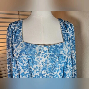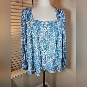 Beyond the Radar Medium Womens Blue Floral Print Long Sleeve Top Boho Flowy