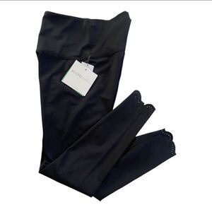 Made of environmentally friendly Compression Lux fabric, this high waisted midi length legging is made to feel light, tight and fits to flatter. Featuring a scalloped hem with laser cut artwork, you'll wear this from barre to brunch.