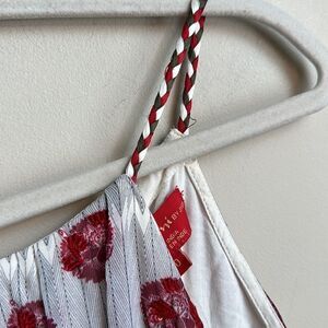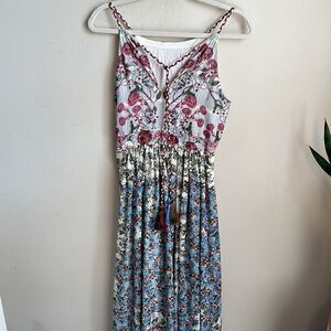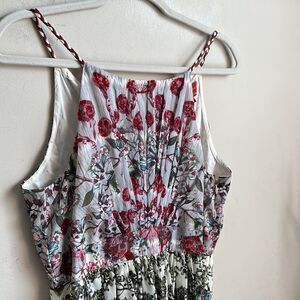 Stunning floral maxi dress perfect for summer special occasions. Beading and embroidery at chest. Side zip. Tassel rope tie back closure. EUC