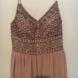 Never been word BHLDN dress size 12. I bought it for my sisters wedding but decided not to wear it because it hit me at a weird spot due to my height. The color is a mauve, less dark than it looks in the photo.
