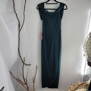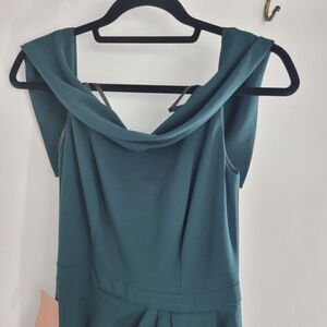 tulip hem, boning at bodice, off shoulder green crepe dress perfect for a winter wedding. tag has mark to prevent store return. New with tag.