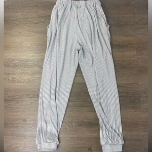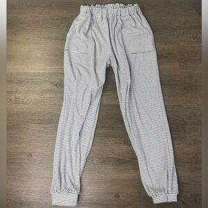 Böhme Women’s Essential White and Black Striped Joggers, size small. In good used condition. See pictures for wear and condition. Fabric content tag is faded.