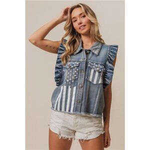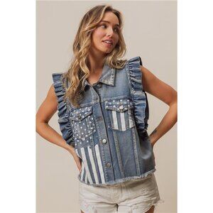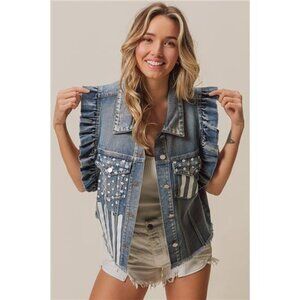 *This denim jacket features an American flag design with a washed finish for a patriotic and vintage-inspired look. The American flag motif adds a bold and statement-making element to the classic denim jacket style. The washed denim gives it a worn-in and casual vibe, perfect for adding a touch of Americana flair to your outfits. Show off your patriotism and sartorial style with this American flag washed denim jacket, a versatile piece that pairs well with a variety of outfits for a cool and trendy ensemble.