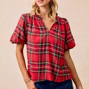 BiBi Christmas Plaid Short Sleeves Ruffled Blouse