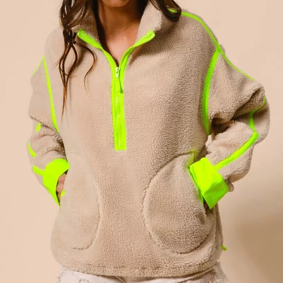 *Stay cozy and stylish in the Contrast Edge Half Zip Up Sherpa Jacket. This jacket boasts a trendy half-zip design and eye-catching contrast edge detailing. Crafted from soft sherpa material, it provides warmth and comfort during the colder seasons. With its high collar, this jacket offers added protection against chilly winds. Elevate your winter wardrobe with this versatile and chic outerwear piece.