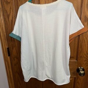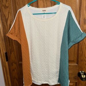 Chic cream top by BiBi. Features teal and rust sleeve accents. Ideal for everyday style. Size medium but is a little oversized. Never worn.