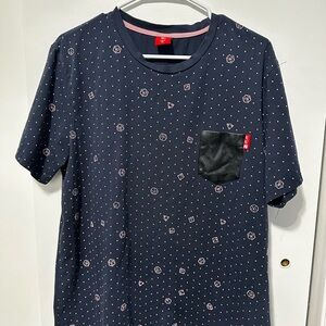 Stylish dark blue top featuring light pink accents. Perfect for casual wear.