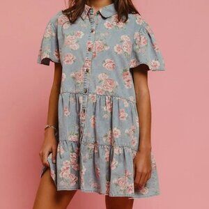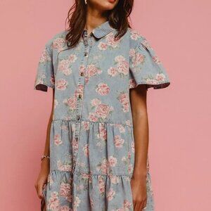 BiBi Floral Print Washed Lightweight Tiered Shirt Dress
