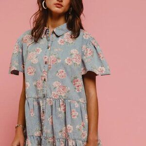 *This charming shirt dress features a delicate floral print on a soft blue background, crafted from lightweight cotton-blend fabric perfect for warm weather. The dress showcases a classic button-front design with a pointed collar, short flutter sleeves, and a fashion tiered construction that creates beautiful movement. The mini length and relaxed silhouette offer both comfort and style, making it ideal for brunch dates, garden parties, or casual outings. The vintage-inspired print and feminine details like the ruffled tiers add romantic appeal while maintaining versatility for various occasions.