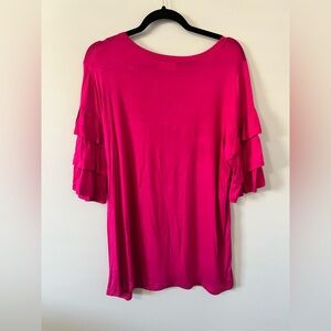 Bright fuchsia tee with stylish ruffle sleeves. Perfect for casual outings.