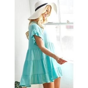 This stylish jersey knit top is a must-have for your wardrobe! Featuring a trendy tiered hem and charming ruffled sleeves, this top adds a touch of elegance to any outfit. The mint color is perfect for adding a fresh, vibrant pop to your look. You'll love the comfortable fit and fashionable design of this versatile top!
