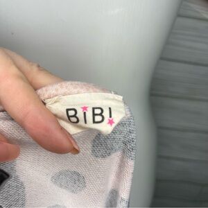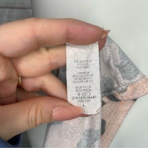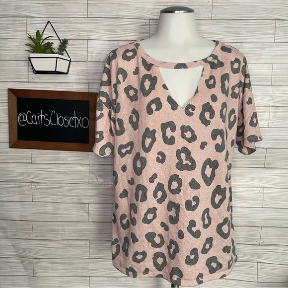 BiBi pink and gray leopard print short sleeve top with triangle cutout along the neckline. Size L.