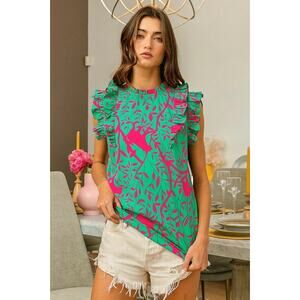 BiBi Leopard Leaves Print Ruffle Sleeve Smocked Woven Top in Jade & Fuchsia