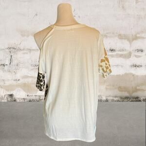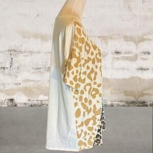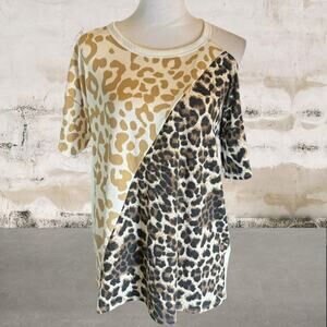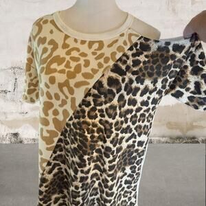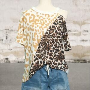 Stylish asymmetrical blouse with leopard print. Features tan and brown patterns. Perfect for casual wear.