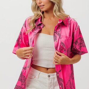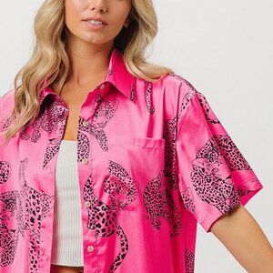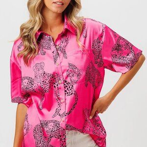 BiBi Leopard Print Short Sleeve Silky Satin Shirt Top