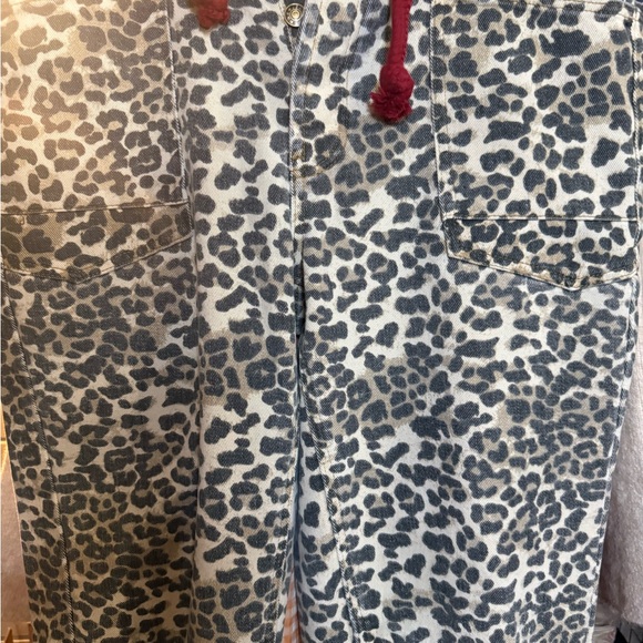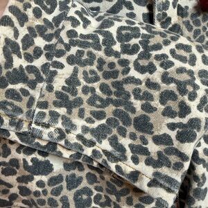 Light leopard-print button shirt featuring two front pockets. Red drawstring detail adds contrast. Casual and stylish layering piece.