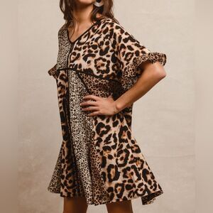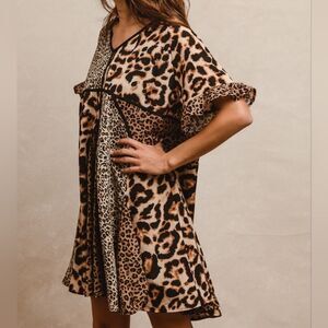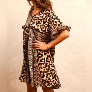 BiBi Leopard Prints Mix Short Ruffle Sleeves Dress Sz Sm Md Lg XL