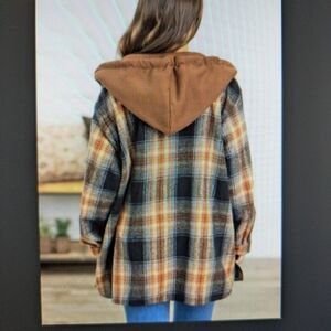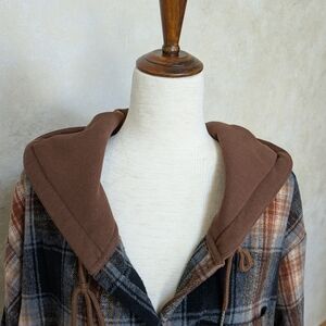 Chic plaid design with a cozy hood. Ideal for layering. Very roomie with a boxy style, measures 25" pit to pit and 17" pit to bottom. Worn as a size 10. The hem is slightly longer in the back. One chest pocket. Only worn once. Smoke free home. Same day shipping.