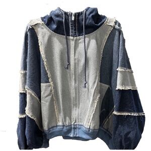 Oversized, stylish patchwork denim jacket with a hood. Features a mix of light and dark blue denim patches.