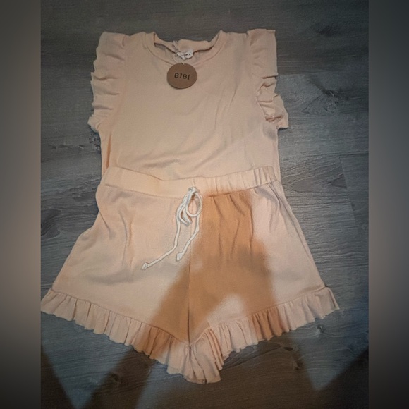 Chic peach romper with ruffle sleeves. Drawstring waist for comfort. Perfect for casual outings.