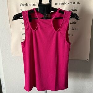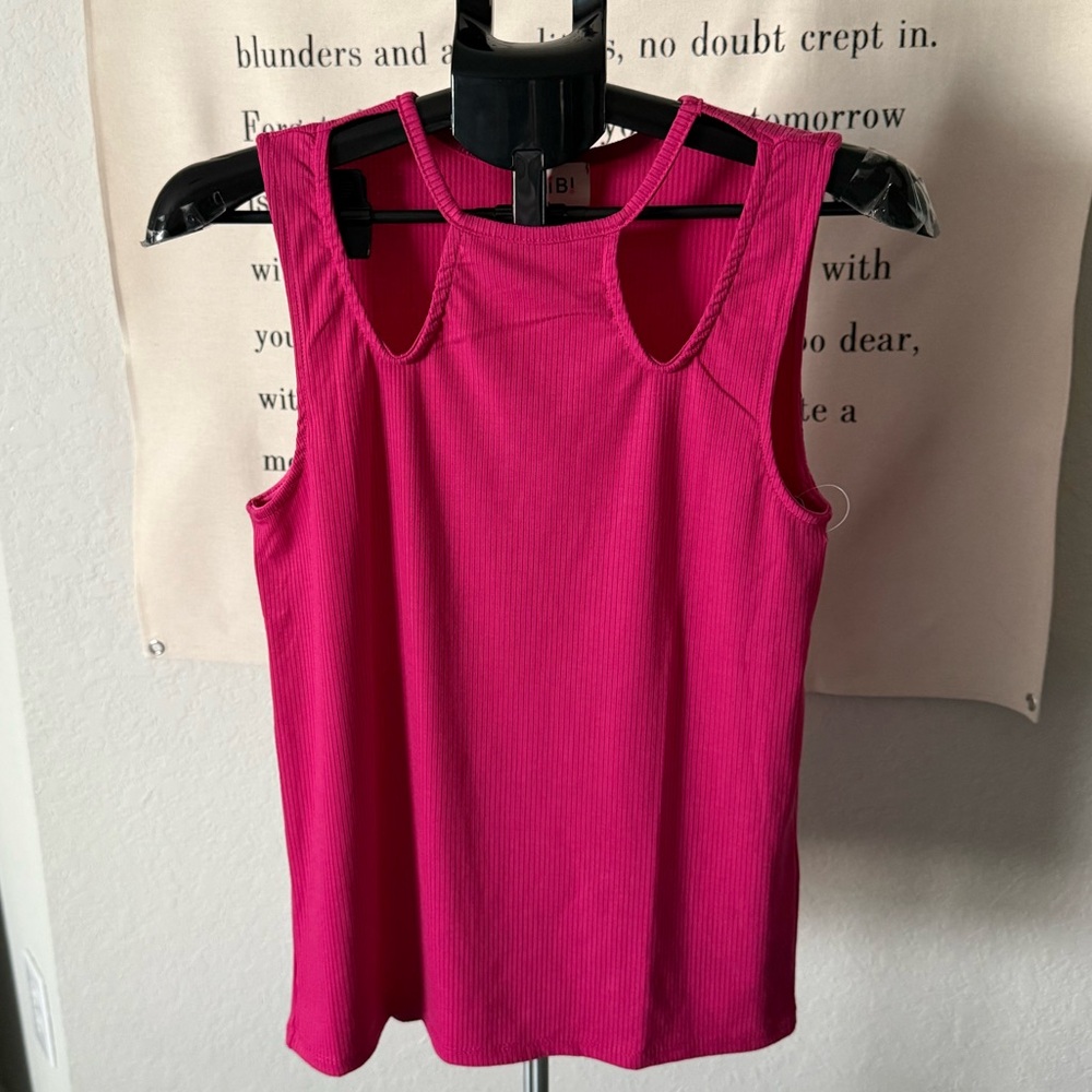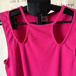 This vibrant pink ribbed tank top from BiBi features a fitted style with cutouts around the neckline.