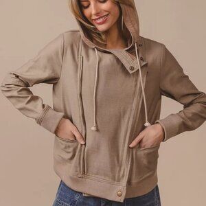 *The Textured Woven Rider Jacket is a sleek and versatile outerwear piece that adds a touch of edge to your look. With its textured woven fabric, this jacket offers a unique and stylish appeal. The rider silhouette typically features a zipper closure, snap buttons, and sometimes a belted waist for a classic moto-inspired look. Pair this jacket with jeans, a tee, and boots for a cool and casual outfit, perfect for transitioning between seasons and adding a stylish layer to your ensemble.