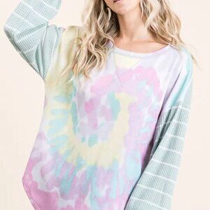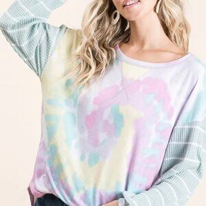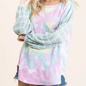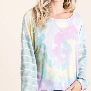BiBi Tie Dye Terry Top with Wide Stripe Thermal Waffle