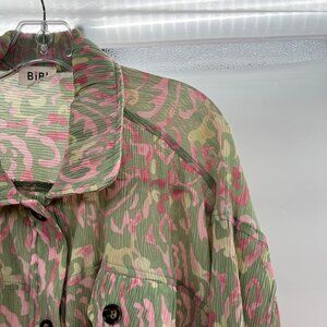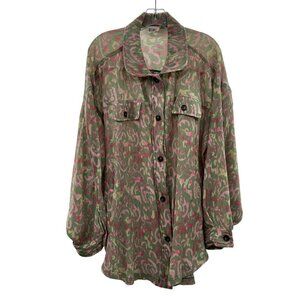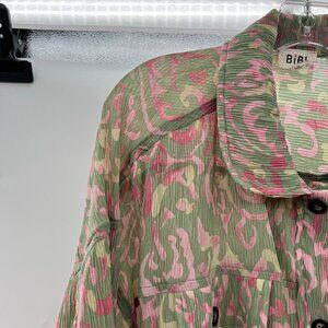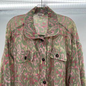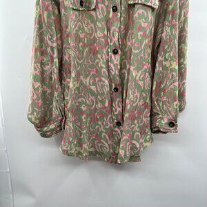 BiBi Women's Button Up Ribbed Long Sleeve Top Green/Pink Size Medium Pockets