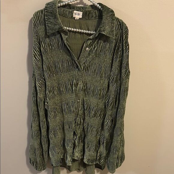 BiBi forest/olive GREEN, long-sleeved, button down, textured shirt; size XL