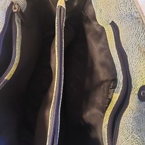 Beautiful painted leather Biacci handbag in excellent used condition. 14 1/2 inches in width, 8 1/2 inches height and 5 inches in depth. This leather handbag is stunning. And it has pockets upon pockets. A great everyday handbag. And a great handbag to keep you organized