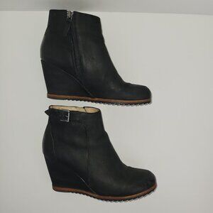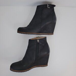 Biala Black Leather Wedge Ankle Boots Side Zip Ankle Buckle Bootie Women’s SZ 37