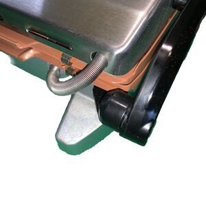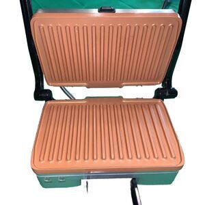 I left some of the pictures against the green background so that you could see that the ones that were trimmed, are just picking up the green reflection. This Panini maker is close to immaculate, although I do see a small thing on the top, which I dont know if is normal or not, take a look at the front of the grill in the middle on the left edge.. if you can live with that inconvenience this is one heck of a deal.