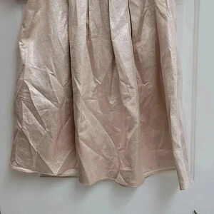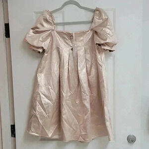 A special edition, 1960’s inspired short length, rose gold lurex dress with exaggerated balloon sleeves. Detailing a deep square neckline, inverted box pleats under the bust, allowing a flowy silhouette and finished with three decorative mosaic, mother of pearl buttons along center front. Paired with rose gold lurex culottes, full-cut and gathered at upper thigh.