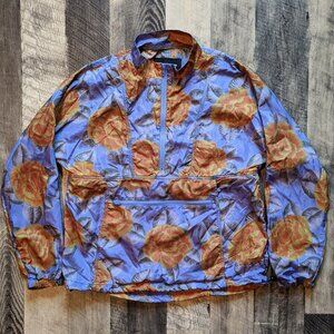 This is a Bianca Chandon Scuba Neck Packable Anorak in the Blue Floral colorway with orange roses. It is in excellent condition. It is a size medium, and the last three images show measurements. Long sleeves, half-zip placket, stand-up collar, zippered front pouch pocket, front slash hands pockets, adjustable cinch cords at hem and waist, elasticized cuffs, lightweight 100% vintage silk taffeta fabric, made in USA.