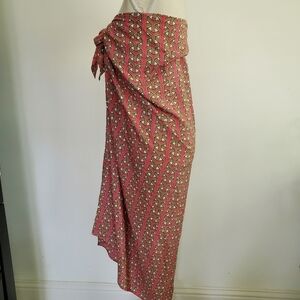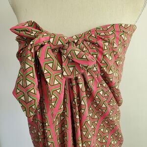 Strapless pink and green patterned silk dress with top tie, inner mesh bra with boning.