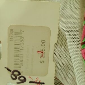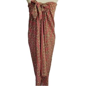 Strapless pink and green patterned silk dress with top tie, inner mesh bra with boning.
