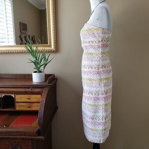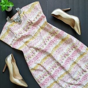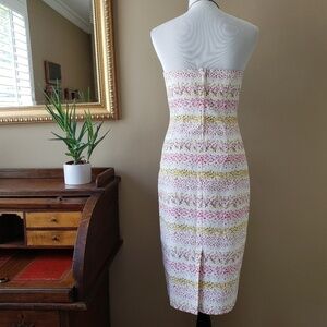 This vintage 90s Y2K strapless sheath dress from Maria Bianca Nero features a gorgeous micro floral print in hues of pink, yellow, an green over an ivory background. It has a structured bodice with side boning, a fitted sheath silhouette, back vent, and a concealed back zip. Made in USA 50% rayon, 40% acetate, 10% Lycra.
