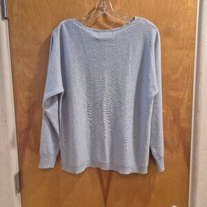 Bianco & Blue Cashmere Blend Sweater Made in Italy. Size Large. Soft lightweight breathable pull over sweater. Classic fit. Long sleeves with lightly ribbed cuffs and waist to give it a tiny bit of structure. The color tag says lilac but its a very light pale blue- sort of like a seafoam color. The pictures with the tags depict the color the best. Wear it casually or dress it up. Easily transitions from the office to an evening out. Minimalist style. Easy to layer. Great for cool nights. Please see pictures for approximate measurements. Quite luxury, preppy, country club.
