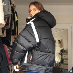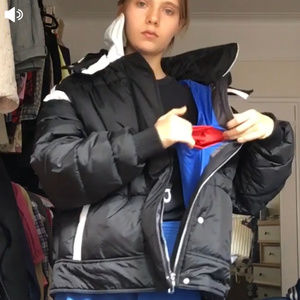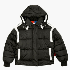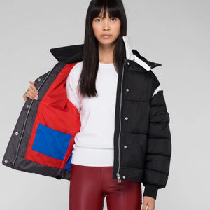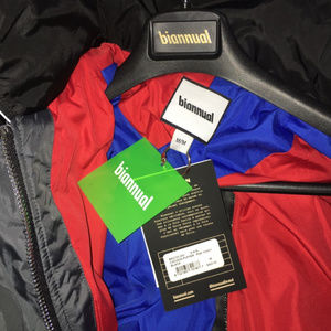 Biannual Cocoon Puffer in Black (brand new with tags retail price $425) Unisex, vegan fur hood and lined pockets!!!!. Coat filled with a sustainable, warm, water-resistant and lightweight recycled cashmere blend called "Supremeloft." Cute #2 patch on the sleeve and the white accents are a sort of patent leather material. Bright primary colors inside #wintercoat #warm #winter #vegan #biannual #unisex