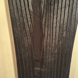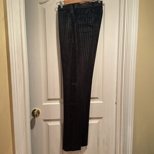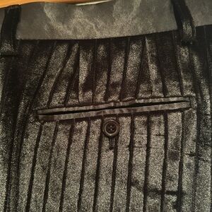 Flat front. Has side pockets and the back pockets has buttons. Not heimed. Very classy